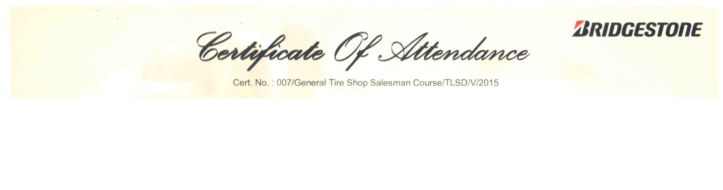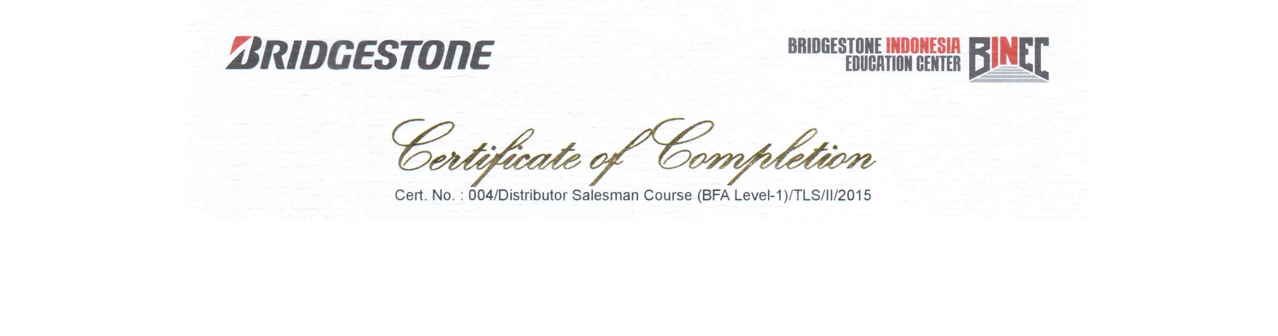 Sertifikat Bridgestone 2015 General Tire Course